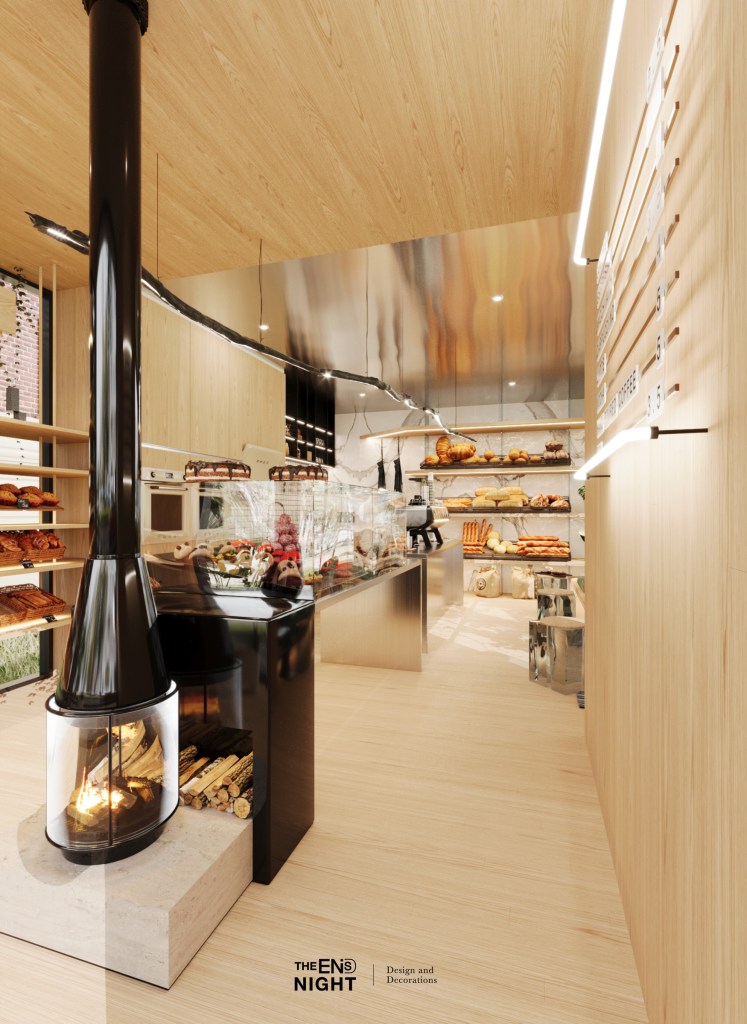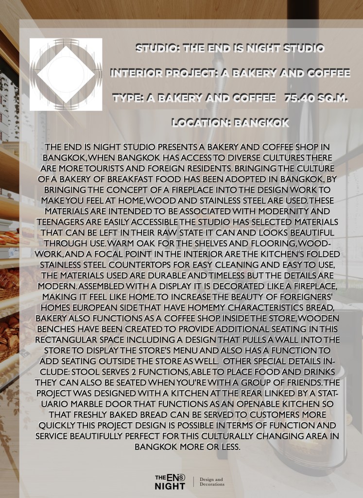 WHEN BANGKOK HAS ACCESS TO DIVERSE CULTURES THERE ARE MORE TOURISTS AND FOREIGN RESIDENTS. BRINGING THE CULTURE OF A BAKERY OF BREAKFAST FOOD HAS BEEN ADOPTED IN BANGKOK, BY BRINGING THE CONCEPT OF A FIREPLACE INTO THE DESIGN WORK TO MAKE YOU FEEL AT HOME, WOOD AND STAINLESS STEEL ARE USED. THESE MATERIALS ARE INTENDED TO BE ASSOCIATED WITH MODERNITY AND TEENAGERS ARE EASILY ACCESSIBLE THE STUDIO HAS SELECTED MATERIALS THAT CAN BE LEFT IN THEIR RAW STATE IT CAN AND LOOKS BEAUTIFUL THROUGH USE. WARM OAK FOR THE SHELVES AND FLOORING, WOODWORK, AND A FOCAL POINT IN THE INTERIOR ARE THE KITCHEN’S FOLDED STAINLESS STEEL COUNTERTOPS FOR EASY CLEANING AND EASY TO USE, THE MATERIALS USED ARE DURABLE AND TIMELESS BUT THE DETAILS ARE MODERN. ASSEMBLED WITH A DISPLAY IT IS DECORATED LIKE A FIREPLACE, MAKING IT FEEL LIKE HOME. TO INCREASE THE BEAUTY OF FOREIGNERS’ HOMES EUROPEAN SIDE THAT HAVE HOMEMY CHARACTERISTICS BREAD, BAKERY ALSO FUNCTIONS AS A COFFEE SHOP. INSIDE THE STORE, WOODEN BENCHES HAVE BEEN CREATED TO PROVIDE ADDITIONAL SEATING IN THIS RECTANGULAR SPACE INCLUDING A DESIGN THAT PULLS A WALL INTO THE STORE TO DISPLAY THE STORE’S MENU AND ALSO HAS A FUNCTION TO ADD SEATING OUTSIDE THE STORE AS WELL. OTHER SPECIAL DETAILS INCLUDE: STOOL SERVES 2 FUNCTIONS, ABLE TO PLACE FOOD AND DRINKS THEY CAN ALSO BE SEATED WHEN YOU’RE WITH A GROUP OF FRIENDS. THE PROJECT WAS DESIGNED WITH A KITCHEN AT THE REAR LINKED BY A STATUARIO MARBLE DOOR THAT FUNCTIONS AS AN OPENABLE KITCHEN SO THAT FRESHLY BAKED BREAD CAN BE SERVED TO CUSTOMERS MORE QUICKLY THIS PROJECT DESIGN IS POSSIBLE IN TERMS OF FUNCTION AND SERVICE BEAUTIFULLY PERFECT FOR THIS CULTURALLY CHANGING AREA IN BANGKOK MORE OR LESS